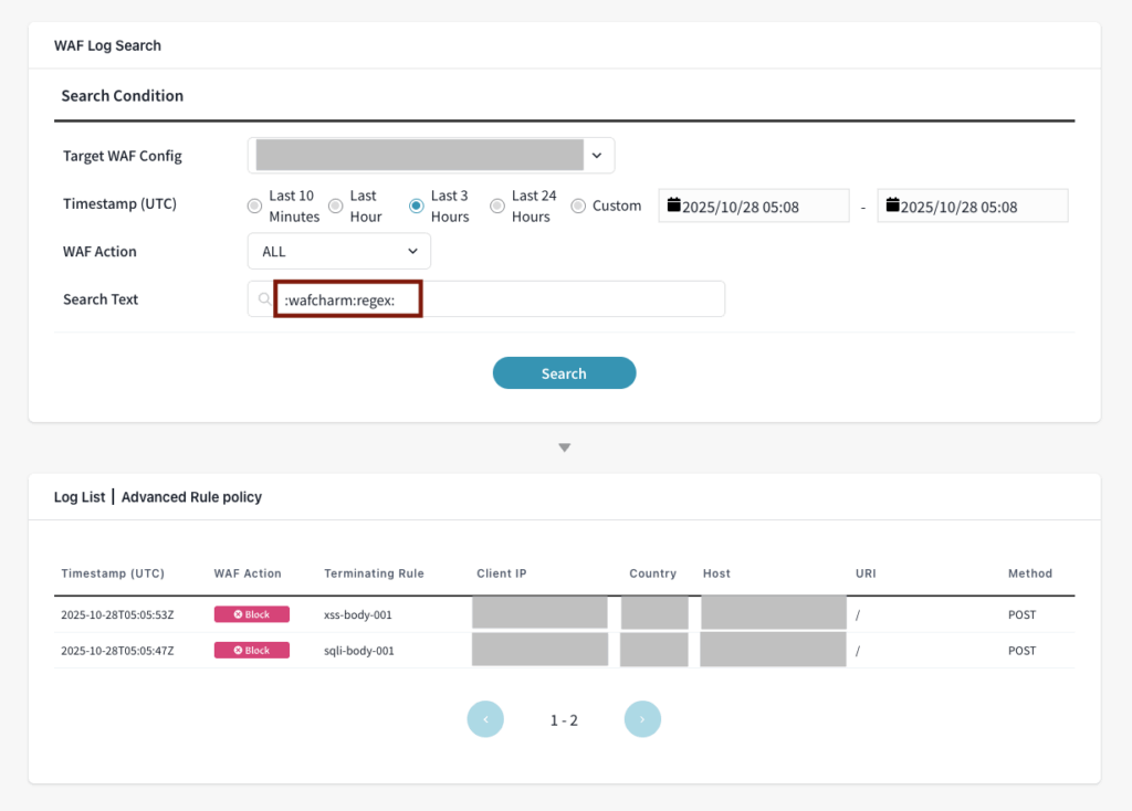 By specifying a rule name or label value in the [Search text] field, you can search for WAF logs that match specific conditions. In addition to the examples mentioned above, you can also search by method, URI, IP address, or host value.