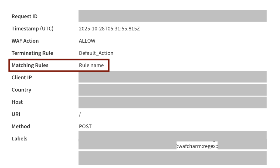 By searching with the value of this label, you can easily check what kinds of requests were detected, such as when reviewing false positives while using Count mode.