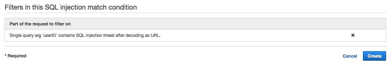 「Filters in this SQL injection match condition」へのフィルター追加が確認できましたら [ Create ] をクリックして作成します。