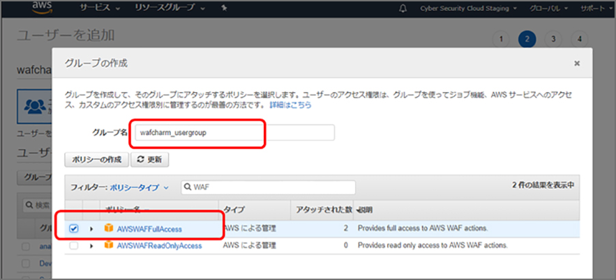AWS Management コンソールにて、WafCharm 用に新たにユーザー・グループを作成します。ご利用にあたり作成するユーザー(グループ)は WAF の FullAccessと S3 およびCloudWatch の Read 権限が必要になります。