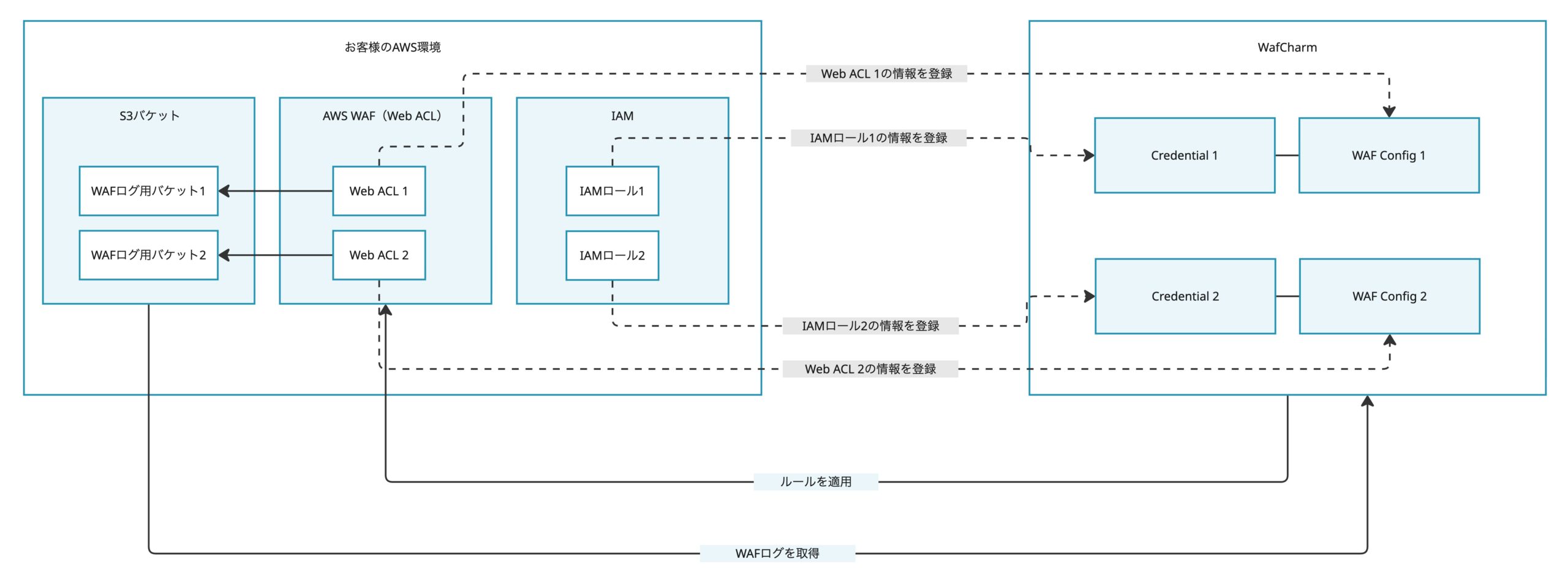 - WafCharmはWAF ConfigおよびCredentialにご登録いただいた情報をもとに、IAMユーザーあるいはロールに紐づけられた権限を用いて、Web ACLにルールを適用する